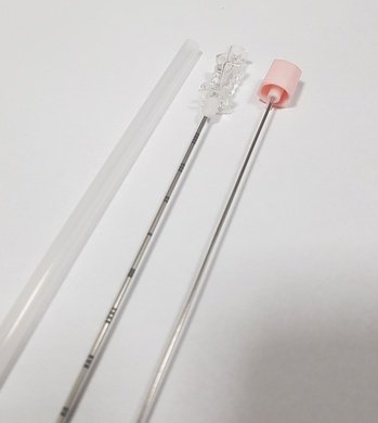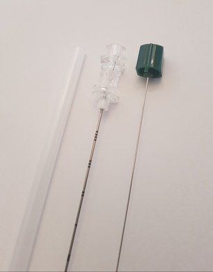 Agulha para bloqueio ou infiltração (facetária, peri-facetária e foraminal) da coluna vertebral, guiados por método de imagem (escopia ou ultrassom).
